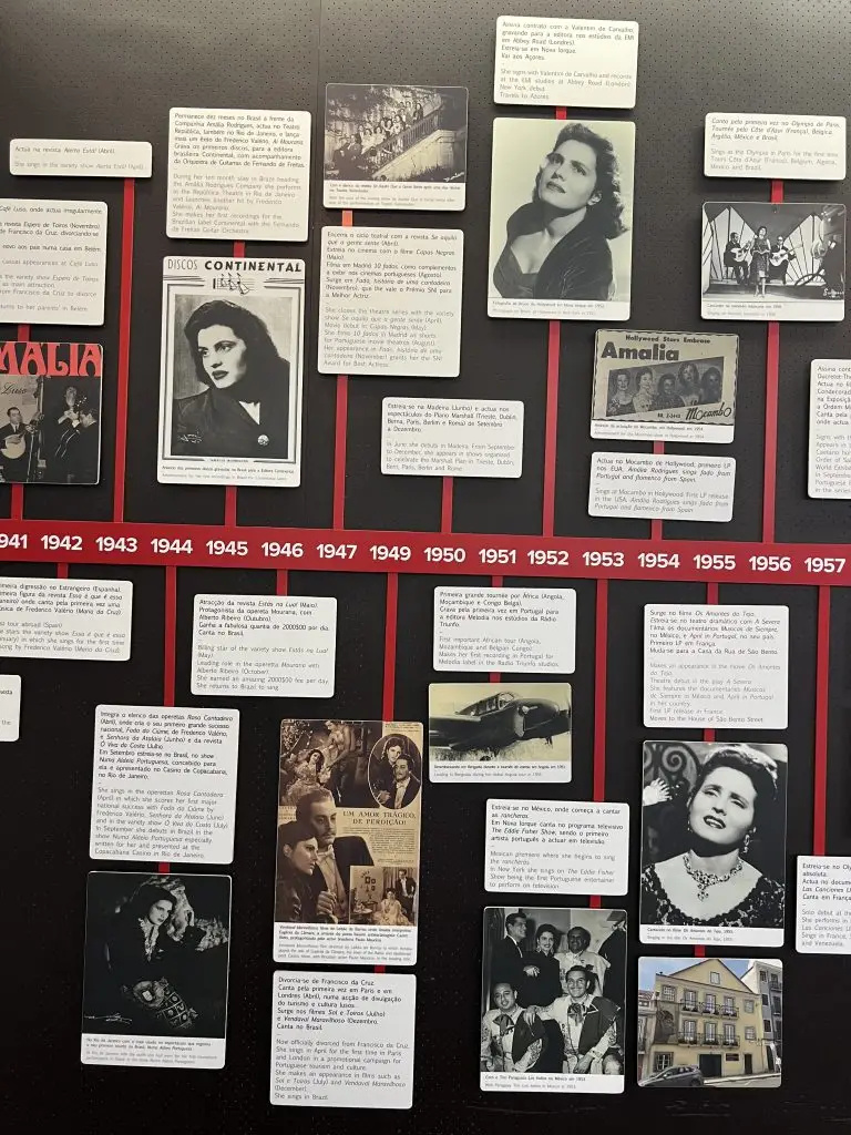 The first room of the museum showcases Amália’s biography on a timeline full of marks and information. Born to a poor family in Lisbon, she discovered her love and talent for singing at a very young age. Her parents wanted her to marry before she would sing in the Fado clubs, as the guide in the museum tells me. So, in 1940 Amália married the Portuguese guitar player Francisco da Cruz. The marriage only lasted a few years. Amália was one of the first women in Portugal to make a divorce.