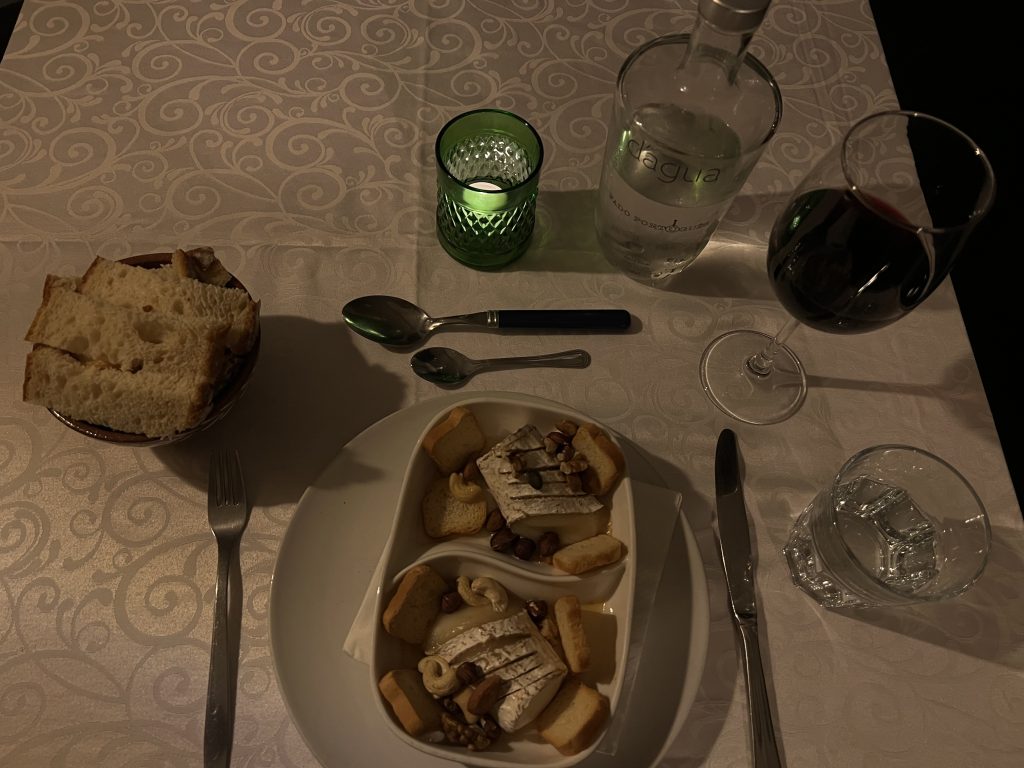 At 21.05h João lights the candles, “they are getting ready” he whispers to me, referring do the musicians. Do I look impatient?, I think to myself, because yes, I am. Before the first live set is played, starters are being served. The delicious goat cheese with honey and walnuts prepares me well for the exquisite Fado presentation.