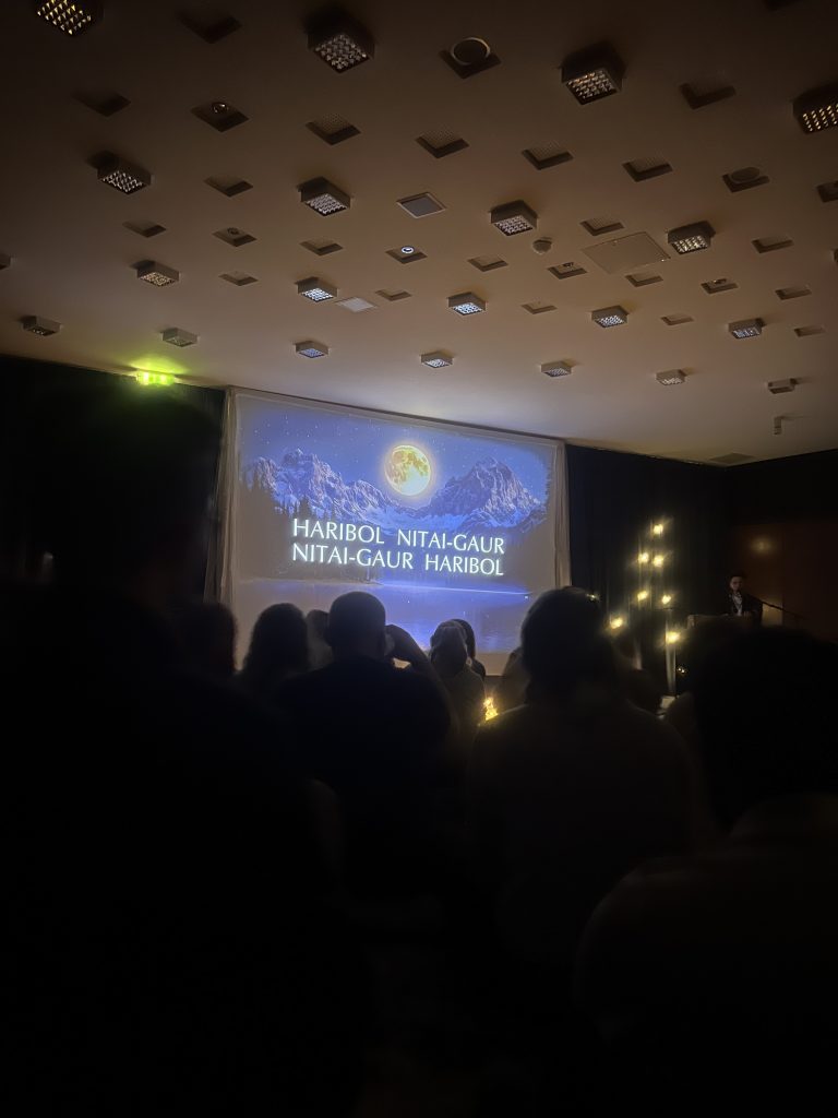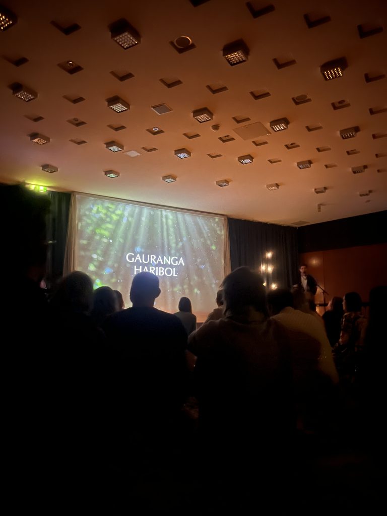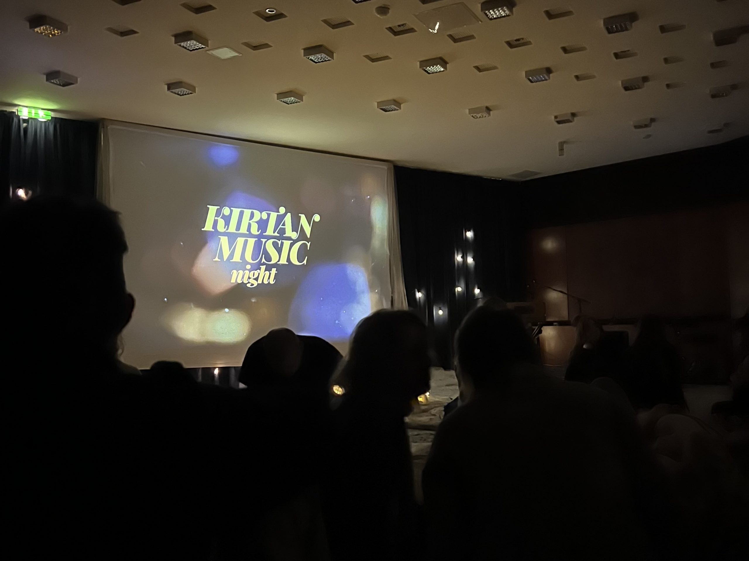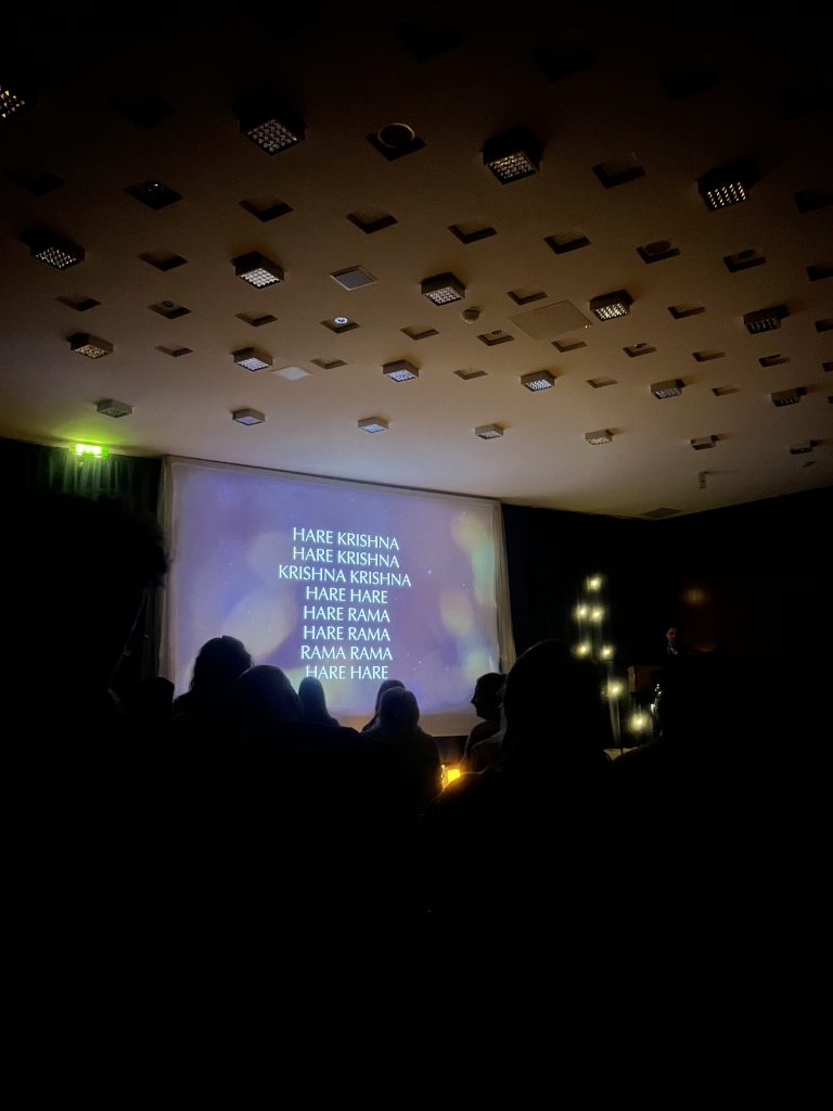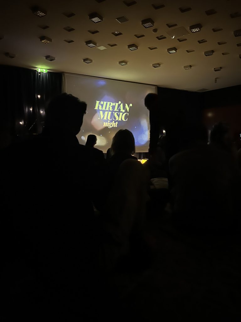 The night begins with a small introduction to Kirtan. The soft spoken voices of the woman and the man in the front already soak me into a meditative state. We start singing along the words the man and the woman give us. Together we create a powerful choir, manifesting love and the good coming towards us.